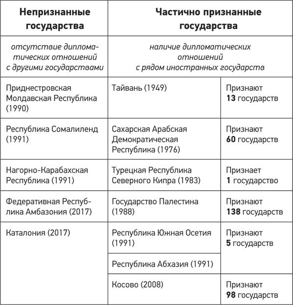Более того, в некоторых ситуациях может срабатывать и обратная логика: отзыв дипломатических отношений и лишение места в ООН может перевести уже признанное государство в категорию самопровозглашенного. Как результат, страны находятся в разной степени становления государственности, но их объединяет то, что ни одна из них не дошла до этой высшей и самой главной стадии обретения государственности.