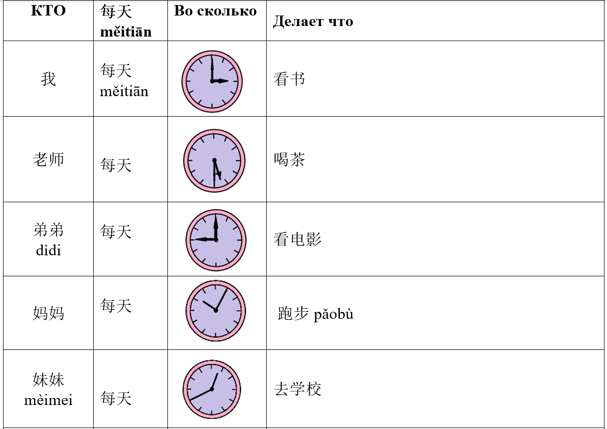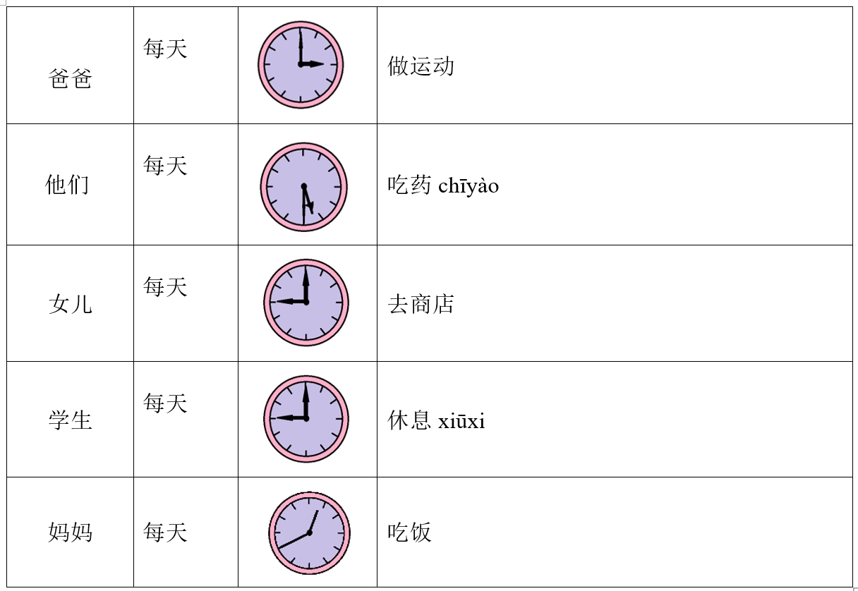 1) Рост моего папы 2.05, а рост мамы 1.80. 2) В эти последние дни дочка очень занята, она работает в больнице, у нее нет времени отдохнуть. 3) Мой сын каждый день встает в 7.15 и идет бегать. 4) Я люблю заниматься спортом, поэтому (所以suǒyǐ) мало болею. 5) Больше всего я люблю играть в футбол. 6) Я съела лекарство, сейчас мое здоровье улучшилось. 7) Он каждый день в 18.30 идет в магазин, он возвращается домой очень уставшим. 8) В пятницу в 12 он выпишется из больницы, в субботу будет в доме отдыхать.