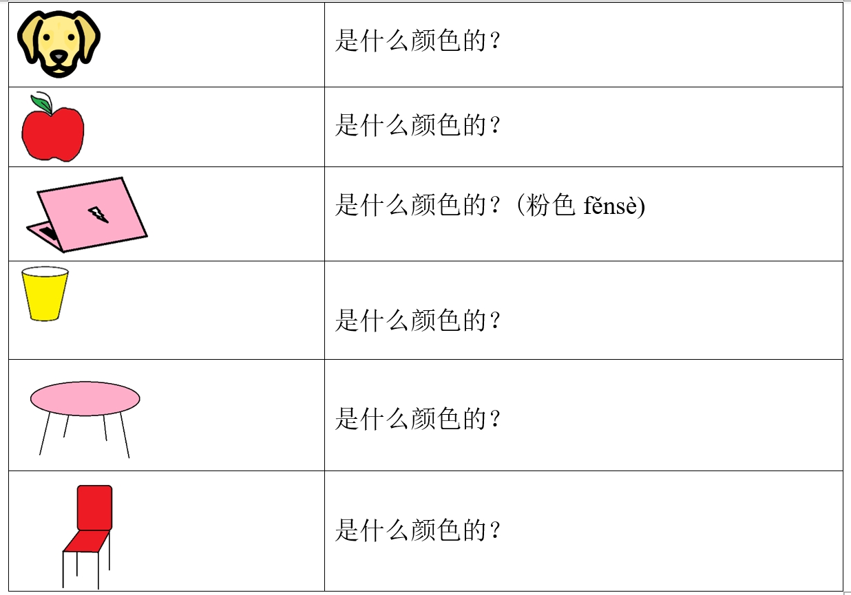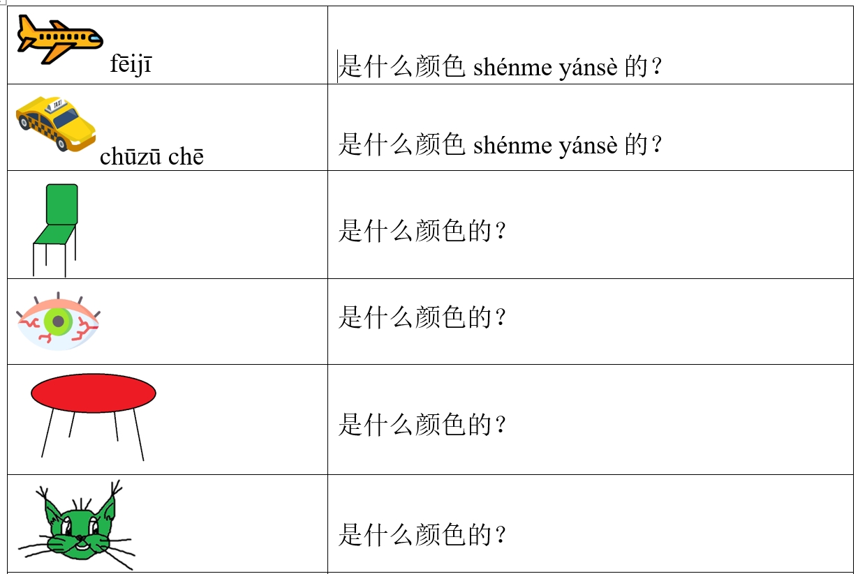 Например: 飞机fēijī是什么颜色shénme yánsè的?飞机是黄色huáng sè的。