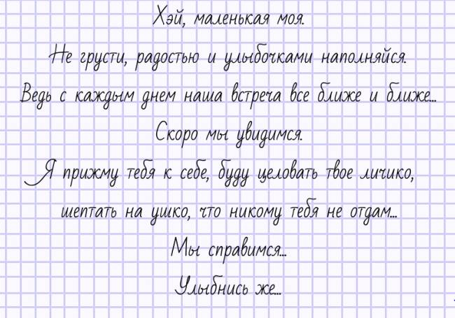 Так не хочу с тобой больше ругаться… Когда все только начиналось, я думала, что так все и будет, что все будет хорошо… Но у нас все происходит какими-то резкими перепадами: от счастливых часов, до грустных и полных нервов дней… Хочу просто счастливых часов, счастливых дней… Хочу, чтобы тебе приснилось что-нибудь очень приятное… Сегодня, помогая Саше, я представила, что на его месте ты… Что мы только въехали в наше гнёздышко, и нам нужно наводить в нем уют. Как мы мило дурачимся и между делом, начинаем спорить – сначала в шутку, потом все больше и сильнее… Но кто-то из нас не выдержит, подойдет и закончит спор поцелуем и крепкими объятьями. Хочу вместе… все делать вместе… Я очень скучаю по тебе… Правда… Надеюсь, что завтра все будет хорошо… Мне очень страшно за тебя… Будь осторожнее, прошу… Я люблю тебя. Приснись мне, пожалуйста.