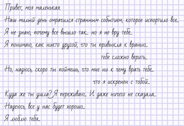 ОН: Ева, солнышко моё… С добрым утром. Надеюсь, тебе снились хорошие, красочные сны… Надеюсь, ты улыбнулась утром, моя милая. Не разбудила меня утром почему-то. Я так хочу просыпаться рядом с тобою… Прижимать к себе… Будить поцелуями… И чтобы ты меня так же будила. То, что мы желаем друг другу перед сном… Я мечтаю об этом каждый день, каждый час… Я знаю, что это не просто мечты. Это будет сбываться. Но так хочется, чтобы поскорее… Давай проведем сегодняшний день полностью вместе. У нас с тобой в последнее время это так редко получается… И я хочу подарить тебе как можно больше улыбок. Ну, что ж… Мне осталось 10 минут до встречи… Сейчас за мной заедет знакомый… Все будет хорошо. Не переживай… Я люблю тебя.