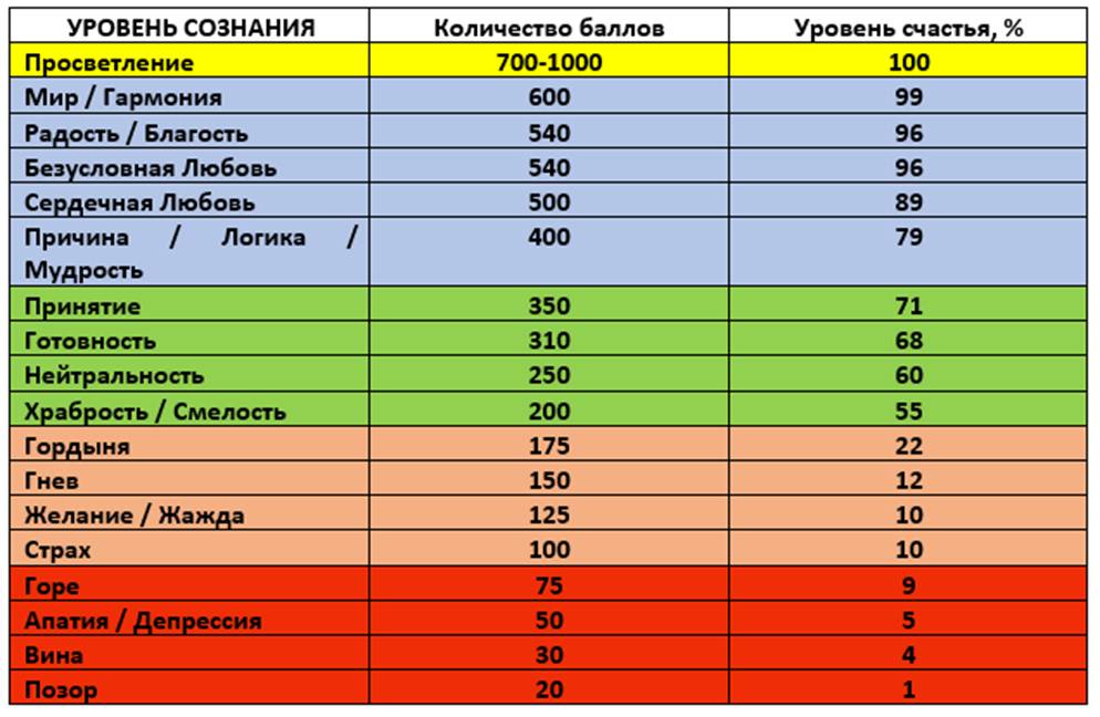 Полная таблица даёт больше информации для интерпретации. Но советую лучше найти саму книгу «От отчаяния к просветлению. Эволюция сознания» Дэвида Хокинса, и прочитать точку зрения самого автора на процессы, характеризующие выделенные уровни сознания.