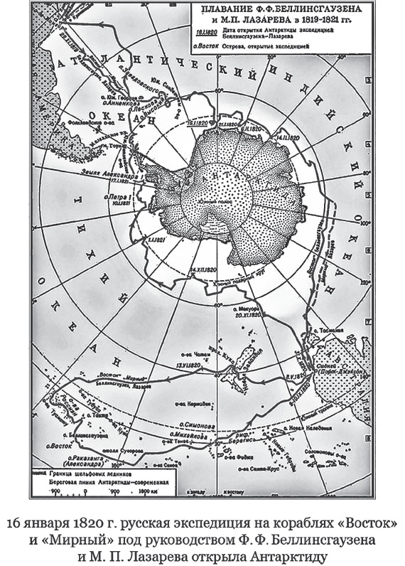 * * *Русские первопроходцы, офицеры Императорского Русского военно-морского флота Фаддей Беллинсгаузена и Михаил Лазарев достигли ледовых берегов Антарктиды 16 (28 января) 1820 года, подойдя к ней в точке 69°21′ ю.ш. 2°14′ з.д. (район современного шельфового ледника Беллинсгаузена, где ныне работает полярная станция «Беллинсгаузен»). Высадиться на ледяной берег военные моряки не смогли, так как шлюпы «Восток» и «Мирный» были парусные, деревянные корпуса могли затереть мощные матёрые льды.