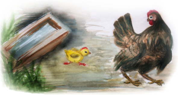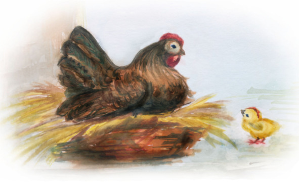 Кукарекает петух Вторит квочка: «ко-ко-ко»,И кудахчет она вслух:«Жить на свете не легко…Вот яйцо чуть желтовато,В нём мой маленький сынок.В доме этом тесновато,Но ещё не вышел срок…»Квочка квохчет, ждёт, печётся.Так проходит день, другой.В скорлупе сыночек бьётся,Хочет к мамочке родной.Вот и трещинка, другая,Клюв пробился в скорлупе.Квочка всё переживает,Позабыла о себе.