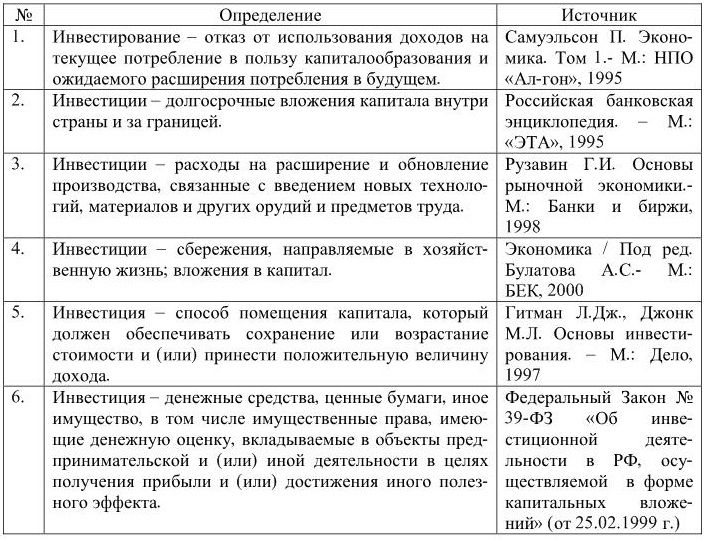 В экономической литературе существует большое многообразие толкований понятия «инвестиций». Анализ различных работ экономистов обнаруживает отсутствие единой универсальной точки зрения на сущность инвестирования. Из приведенных ниже определений инвестирования (таблица 1) наиболее точно раскрывает это экономическое явление П. Самуэльсон и близка трактовка этого понятия у Дж. Кейнса.