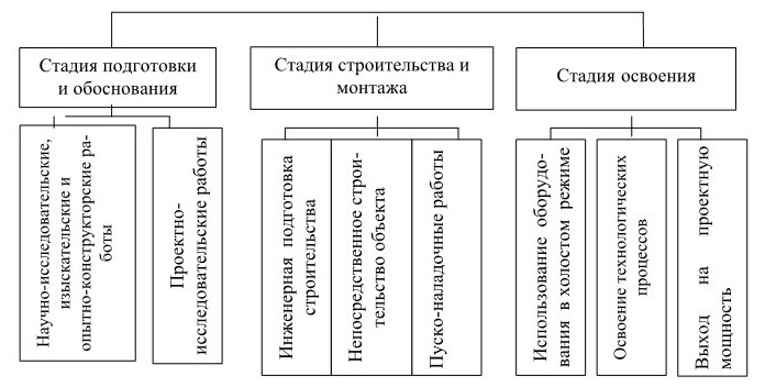 Процесс формирования и использования инвестиционных ресурсов охватывает определенный период, который принято называть инвестиционным циклом. Если рассматривать реальные инвестиции, то он включает следующие этапы: научные разработки; проектирование; строительство; освоение (рис. 2) [11].