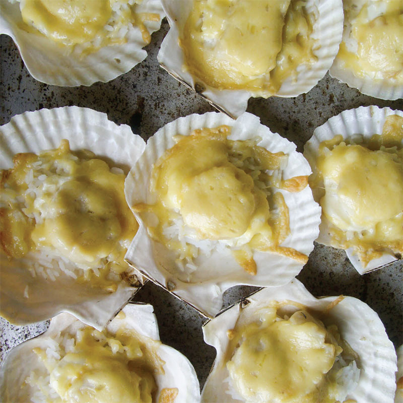 • На каждую раковину равномерно выложить отварной рис, добавить соевый соус, мякоть гребешка, предварительно обжаренный лук, ломтик помидора, майонез и сверху натертый сыр.