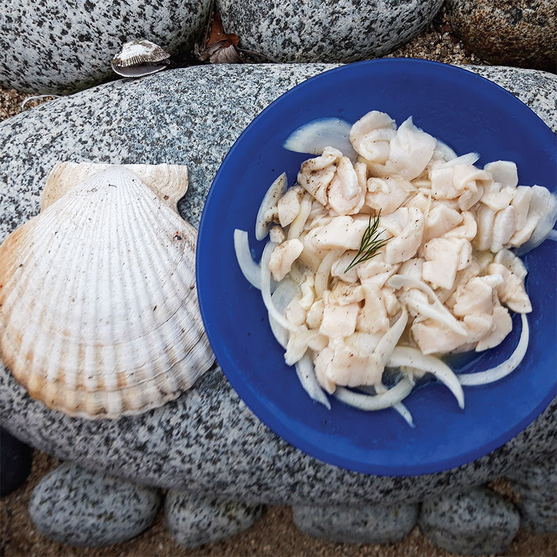 • Нарезать полукольцами репчатый лук, перемешать с гребешком, добавив по вкусу соль и перец.