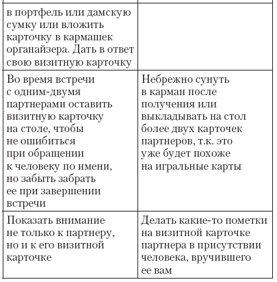 В стандартных ситуациях общения, после представления и обмена рукопожатиями, визитную карточку вручает младший по статусу или возрасту старшему по статусу или возрасту, гость – хозяину. Визитными карточками принято обмениваться в начале, а не в конце встречи, иначе это может быть воспринято как отсутствие изначального интереса к знакомству с партнером.