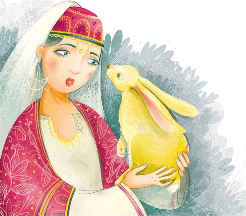 Наверху была приоткрыта дверь, зайчик забежал в неё, царевна вошла следом и оказалась в чудесной комнате, пол которой был устлан шёлковыми коврами, а стены украшены золотом и драгоценными камнями. У каждой стены стояла тахта с бархатными подушками, а в каждом углу – золотой сосуд с благовониями.