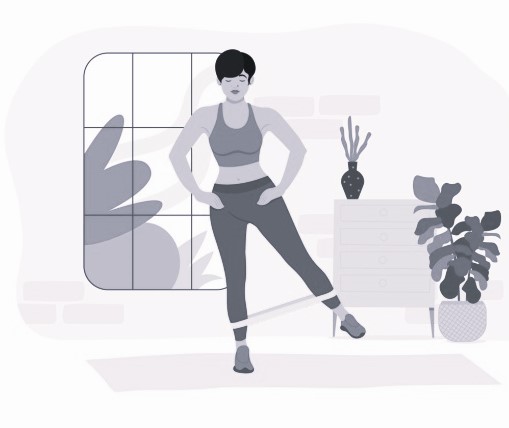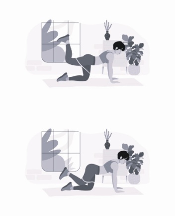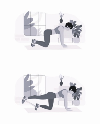 2) Махи ногами, усиленные резинкой. Исходное положение: на четвереньках, резинка располагается на бедрах, немного выше коленей. С выдохом поднимаем согнутую ногу вверх, пятка направлена в потолок. Затем согнутую ногу опускаем вниз, накрест с голенью противоположной ноги. 2-3 подхода по 20-30 раз на каждую ногу.