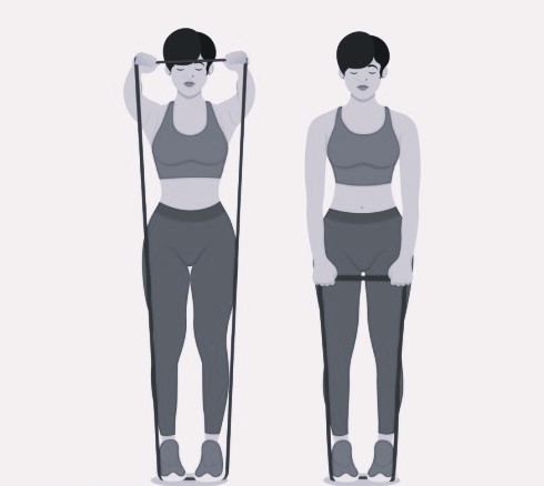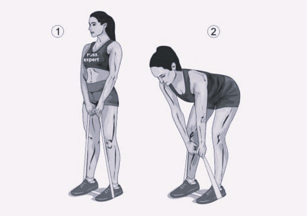 Исх. положение: расставить ступни на ширине бедер, обмотать слегка расставленные стопы петлей эластичной ленты; нижняя часть спины должна иметь прогиб. Техника выполнения: согнуться в талии и в коленях, держась за резинку. Медленно выпрямить спину, смотреть прямо перед собой.
