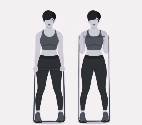 7) Упражнение для бицепса с помощью фитнес-резинки. Все знают это упражнение. Просто обычно его выполняют с помощью гантелей (или штанги). Но, если у нас есть в наличии фитнес-резинка, то поему бы не использовать ее? Итак, исходное положение: стоя, стопы на ширине таза, резинка под стопами, спина прямая, взгляд – прямо перед собой. Берем в руки резинку так, как показано на картинке, и плавно, одновременно с выдохом, сгибаем руки в локтях и приводим предплечья к плечам. С выдохом – плавно возвращаем руки в исходное положение. В зависимости от силы сопротивления фитнес-резинки, я рекомендую начать с 12-15 повторов, 3 подхода.