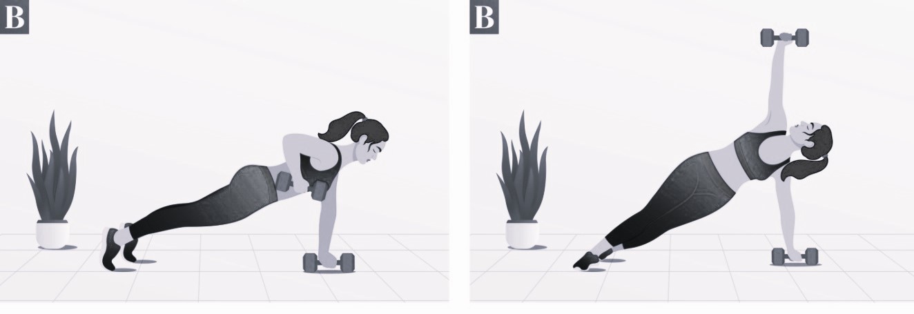 Это же упражнение можно еще усложнить (настоятельно рекомендую упражнения усложнять чаще). Исходное положение: планка на вытянутых руках, на гантелях. С выдохом, притягиваем гантель к груди, держа локоть как можно ближе к корпусу. Затем, аккуратно, не спеша, отводим эту же руку наверх, выходя в боковую планку. Далее снова возвращаем руку с гантелью к груди, и, наконец, возвращаемся в исходное положение. 4-6 подходов по 6-10 раз на каждую сторону.