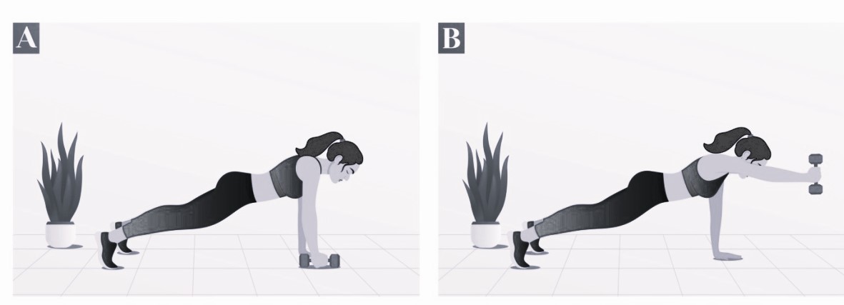 6) Планка с гантелями (многосоставное упражнение). Упражнение, конечно, не для начинающих, но среднему и продвинутому уровню стоит попробовать. Исходное положение: панка на вытянутых руках, в руках – гантели, опора – на них же. С выдохом, подтягиваем одну гантель к груди, затем, с вдохом, возвращаем обратно. Затем – меняем стороны. 4-6 подходов по 6-10 раз на каждую руку.