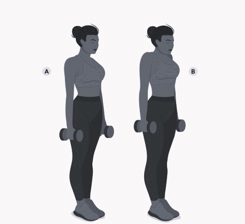 12) Подъем плеч с утяжелением (гантелями или гирями). Исходное положение: стоя (можно сидя с прямой спиной), стопы на ширине плеч, взгляд – прямо перед собой, в руках – гантели. Упражнение простое: поднимаем плечи вверх, к ушам, затем опускаем в низ, в исходное положение. В зависимости от веса утяжелителей выполнить 3-5 подходов по 6-15 раз.
