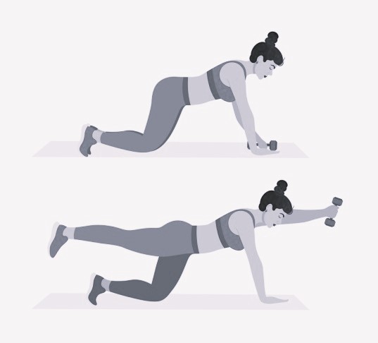 13) Хорошо знакомое нам упражнение для укрепления мышц спины на четвереньках. Исходное положение: стоя на четвереньках, гантель в руке. Поочередно глядя вниз, на пол, вытягивай противоположные руку и ногу, задержись наверху на 3-5 секунд, затем – поменяй стороны. Не бери большой вес гантели. 0,5-1 кг более, чем достаточно.