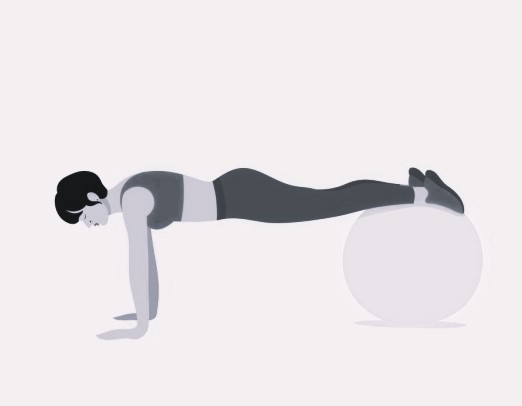 2) Планка на фитболе. Голени и стопы – на фитбол, ладони – под плечи, взгляд – в пол. Держи корпус прямым! Держи положение столько, сколько сможешь. Желательно, от 40 секунд.