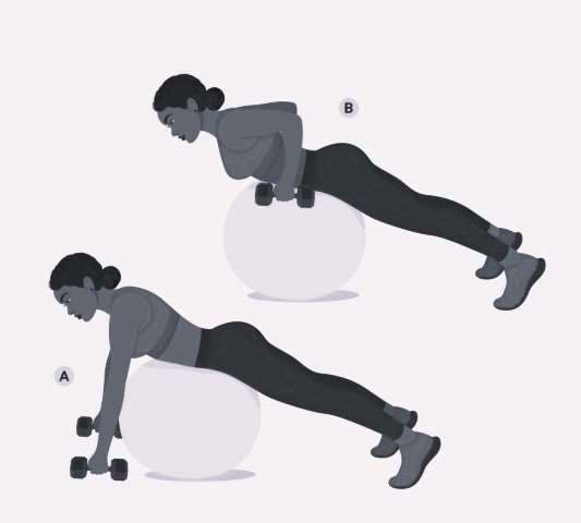 7) Отжимания на фитболе. Исходное положение: бедра, таз и живот – на фитболе, руки на полу, ноги – прямые, на весу. Сгибаем локти, сохраняя прямое положение корпуса и ног. Отжимаемся, с выдохом выпрямляя руки. 3-4 подхода по 10-12 раз.