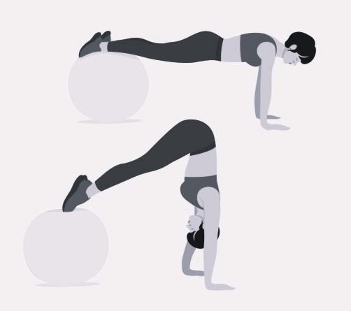 3) Планка – стойка на руках. Ох, сложное упражнение! Для подготовленных, конечно. Исходное положение: планка на фитболе. С выдохом, сокращая мышцы пресса, опираясь на руки и стопы, «подкатываем» фитбол ближе к корпусу. С вдохом – возвращаемся в исходное положение. Опытные «пользователи» точно знают, сколько раз нужно (по ощущениям) выполнить упражнение. Но, всё же, от 2-3 подходов по 10-12 раз. Если очень тяжело, но хочется, то можно опираться и голенями тоже (оставив ноги согнутыми).
