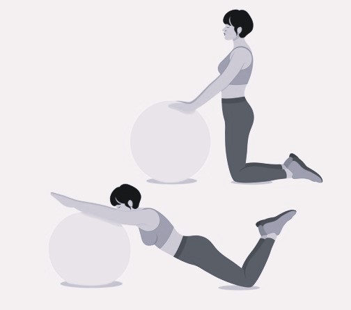 4) Упражнение для мышц кора. Исходное положение: на коленях, перед фитболом. Размести руки на фитболе, локти прямые. Зафиксируй положение корпуса в жестком, прямом положении и как бы «прокатись» предплечьями по фитболу до локтей. Получается своеобразная планка на коленях с руками на фитболе. Далее ( и это самое тяжелое), вернись в исходное положение. Главное: не прогибай поясницу! 3-4 подхода по 6-12 раз.