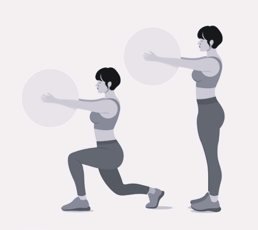 5) Выпады с фитболом. Исходное положение: стоя, ноги на ширине плеч, фитбол на вытянутых руках, спина прямая. Поочередно отшагиваем назад, «в выпад». Следи за тем, чтобы колено не выходило за носок и не образовывало острый угол. 3 подхода по 10-18 раз.