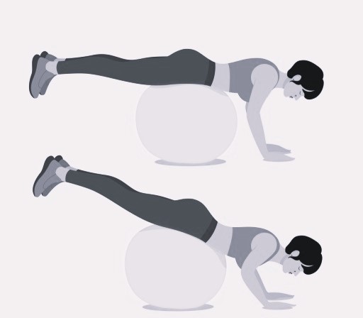 6) Планка на предплечьях на фитболе на одной ноге. Здесь всё предельно просто: встаем в планку, предплечья располагаются на фитболе. Поочередно поднимаем одну ногу, задерживаемся на несколько секунд, затем меняем ногу. 3-4 подхода по 5-12 раз.