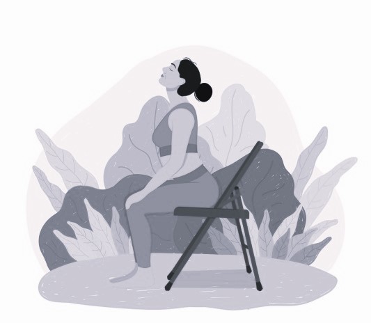 3) Упражнение «кошка-корова» на стуле (разминка для позвоночника). Это упражнение отлично можно использовать в течение рабочего дня для разминки. Здесь все просто: с вдохом прогни спину, выставляя грудную клетку вперед, а с выдохом – округляй спину, тянись лопатками назад. 12-20 раз.