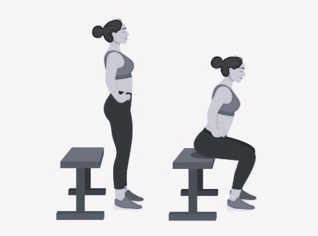 8) Приседания со стулом. Спина прямая, стопы на ширине таза. Руки можно вытянуть перед собой, а можно сложить удобно. С вдохом садимся, чуть касаясь стула. С выдохом – поднимаемся. 12-20 раз за 2-3 подхода.