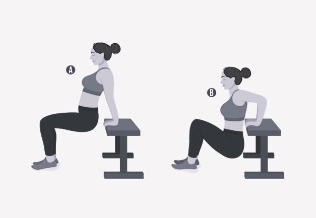 9) “Обратные” отжимания от стула. Это то самое упражнение от дряблых рук. Для тех, кому тяжело – ноги согнуты. Кто готов к нагрузке – выполняем упражнение с прямыми ногами. Как дышать? Главное не задерживать дыхание! Вдох – садимся, выдох – выпрямляем. Выдох там, где нагрузка. От 12-15 раз 2-3 подхода.