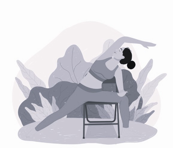 2) Поза «угла» на стуле. Сядь одним бедром на стул, другую ногу – вытяни. Предплечье одной руки помести на согнутом бедре, другую руку вытяни в диагональ, взгляд наверх. Задержись в таком положении на 1-2 минуты, затем поменяй стороны.