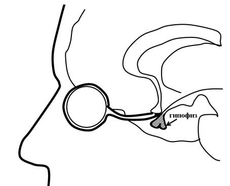 Межбровье (интан). Хрустальный зал, чакра «третьего глаза» – центр высшей интуиции и творчества (синяя). Расположена на лбу между бровями. С этой точкой соотносится управляющий цент эндокринной системы – гипофиз («хрустальный дворец»). Он находится внутри черепа, приблизительно в 8 см от переносицы (рис. 5). Когда точка гипофиза открыта, человек ощущает себя мудрым, если закрыта – он не способен к принятию решений.