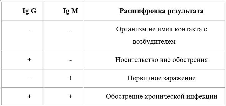 О давности заболевания можно судить по виду иммуноглобулинов, которые определяется в крови: М или G (таблица 1):