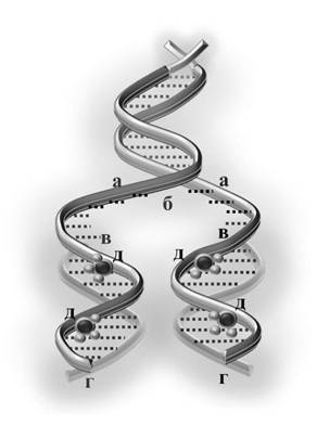 Воспроизведение клеток происходит посредством репликации ДНК (рис. 5). При этом она раскручивается на две цепочки РНК (а). Они расходятся, образуют репликационную вилку (б). Затем каждая РНК становится матрицей, на которой достраивается аналогичная цепь (в). В результате образуются две новые двуспиральные молекулы ДНК (г), идентичные родительской молекуле.
