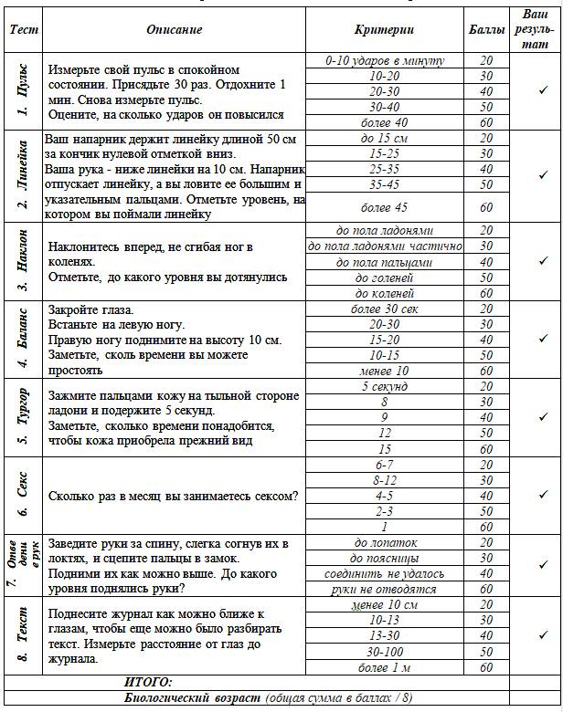 Каждый результат, записанный вами в таблицу, характеризует соответствие состояния отдельного органа или системы организма той или иной возрастной группе. Для определения вашего биологического возраста сложите все полученные числа из последней колонки и разделите результат на 8.