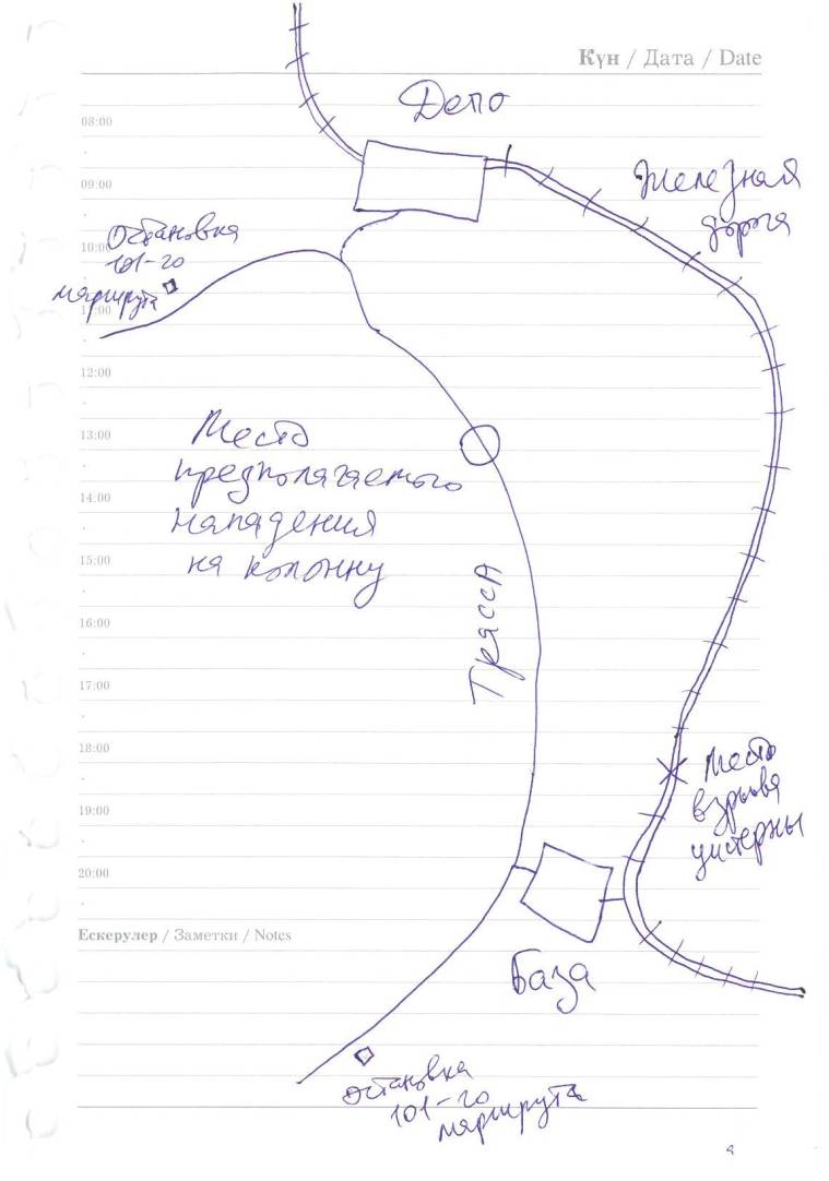 – Смотрите, – Ментыбаев ткнул ручкой в листок, и все остальные, включая меня, подались вперед, склонившись над примитивной картой. – На окраине города у нас есть депо. Это главное депо, из которого выезжает большинство поездов нашего отделения. Километрах примерно в пяти южнее, то есть ближе к центру города, находится ремонтная база со складами. Не спрашивайте меня, почему все так построено – этого я не знаю, и база, и депо существуют еще с советских времен, когда-то они были частью Турксиба. Примерно недели две назад депо понадобились колесные пары. Заказ передали в склады и планировали транспортировать по железной дороге. Но перед самой отправкой недалеко от базы произошел взрыв цистерны с топливом. Почти сто метров путей оказалось испорчено. С рельсами и шпалами сейчас проблемы, поэтому ремонт затянулся, и колесные пары решили перевезти по обычной асфальтированной трассе. Мы стараемся избегать выхода на территорию города, но депо настоятельно требовало колесные пары, поэтому экспедитору было дано задание нанять несколько больших фур и перевезти груз. Так и было сделано. Колонна выехала из ворот склада после обеда в 14.30, но в депо так и не приехала. Около 14.45 с рации экспедитора был сделан звонок на центральный пульт базы. Но это говорил не экспедитор, а водителей одной из фур. Он успел сказать только следующее: «Это маршрут 101…», после чего послышался звук глухого удара, и связь прервалась. Этому звонку не придали значения и вспомнили о нем только вечером, когда хватились колонны.