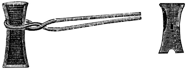 Обжимка (рис. 14–16). Под этим названием известны в кузнечном деле металлические формы, состоящие из двух половинок, в которых проделаны углубления, соответствующие очертанию наружной поверхности вещи, которую хотят отковать. Нижняя часть обжимки вставляется в гнездо ручкой. Отковываемую вещь помещают в отверстие, образуемое обеими половинками обжимки, причем края их не сойдутся. Тогда молотобоец бьет по верхней наружной поверхности обжимки, пока края обеих половинок плотно не сойдутся одна к другой и вещь не примет требуемую форму.
