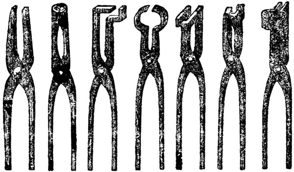 Клещи (рис. 20–26) служат для держания обделываемой вещи на наковальне, переноски, поворачивания и вообще во всех случаях, когда нельзя взять металл прямо руками. Форма губ клещей бывает весьма разнообразна и зависит от формы охватываемой ими вещи, а также и от способа удержания в известном направлении. На концы ручек во время работы надевается кольцо или крючок (рис. 27 и 28), чтобы вещь, охваченная клещами, держалась в них твердо. Клещи не снимаются с вещи все время работы, и только если они сильно накалятся, то, сняв и разжав клещи, надо их охладить, опустив в холодную воду.