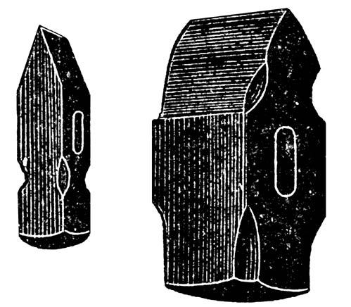 Молотки. Наиболее важный и необходимый для кузнеца инструмент – молоток, который бывает двух родов – маленький, называемый ручником (рис. 8), и большой – кувалда (рис. 9). Оба эти молотка насаживаются на соответствующие им по величине и весу ручки березового или какого-либо другого твердого и вязкого дерева.