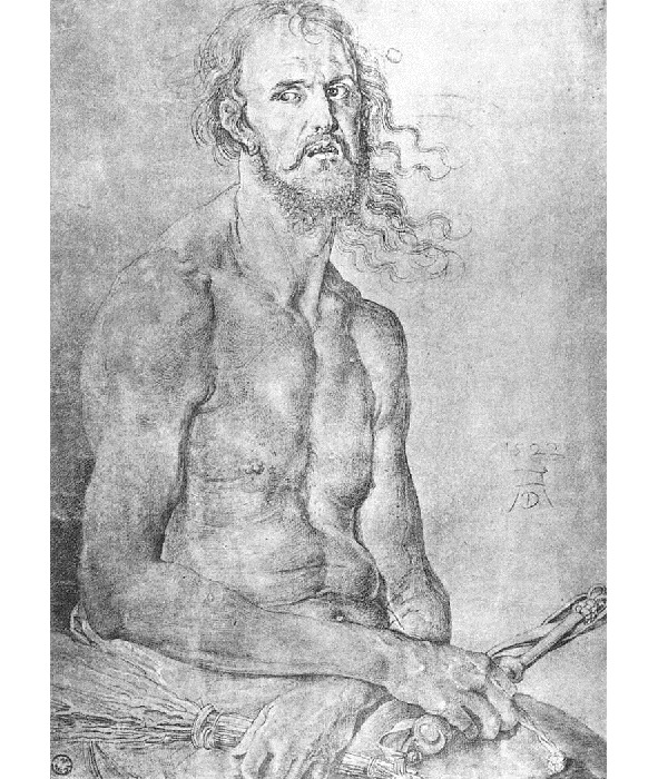 Плечи у него ссутуленные, голову запрокинул, глаза страшные, пустые. И эта плетка. Не было больше таких людей. Дюрер так себя уничтожал, писал о своей несовершенности, ничтожности и греховности. Он себя ненавидел. Посмотрите, как он показывает свой автопортрет на Страшном Суде, где Варфоломей держит в руках нож и только что снятую шкуру с живого Микеланджело, на которой нарисован его автопортрет.