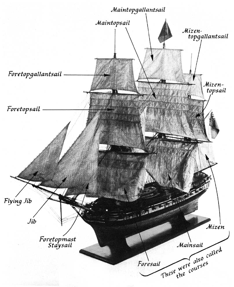 Now for the sails and the rigging. A square-rigged ship had three masts, of course, and these masts were held up by shrouds on each side, by stays to keep them from pitching backwards, and by back-stays to keep them from pitching forward: the shrouds had ratlines across them, to make ladders up which the seamen could climb to reach the upper rigging and the sails; and the first set of shrouds led to the platform called the top, or fighting-top, which stood at the junction of the lower-mast and topmast and which served to spread the shrouds for the next section of mast – these masts, by the way, were made to slide up and down through the top, so that in an emergency the topgallantmasts and even topmasts could be struck down on deck. The masts had yards slung across them horizontally, and it was to these yards that the most important sails were attached. The mainmast had a mainyard for the mainsail, a maintopmast yard for its topsail, a maintopgallant yard, and above that, in fine weather, a royal yard: the foremast had the same four yards with fore tacked on to their names: the lowest yard on the mizen, however, was called the crossjack, which hardly ever had a sail spread on it, because the chief sail on the mizen was a fore-and-aft sail spread by a gaff or lateen over the poop; the rest of its yards were the same. The bowsprit too had its yards and sails – the spritsail and the spritsail-topsail. There were other sails spread on the stays and various booms, but these were the important ones.