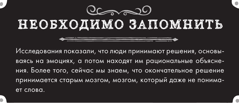 Шаг за шагом мы поймем взаимосвязь между «старым мозгом» и «новым мозгом» и то, как первый доминирует над последним во всем, начиная с выживания и заканчивая принятием любого решения. Вывод следующий: покупатели XXI века имеют гораздо меньше контроля над своим рациональным выбором и решениями, чем они думают!