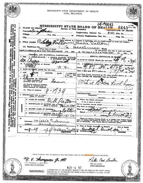 Versione Ufficiale: Infarto dovuto a un difetto congenito della valvola mitralica. Una conseguenza molto frequente della sifilide, per cui sembrerebbe tutto a posto. Eppure il vizio della mitrale era facilmente riconoscibile anche a quei tempi mediante una semplice auscultazione: come mai il suo medico curante, imposto peraltro dalla sua casa discografica, NON SE NE ERA MAI ACCORTO? Come mai non gli furono somministrati i farmaci atti a contrastare un eventuale prolasso? E soprattutto…se il difetto era così grave da condurlo alla morte, COME MAI NON GLI FU PROIBITO di lavorare fino alla fine? Inoltre il mezzadro JIM EDWARDS, suo amico d’infanzia, riferisce che la veglia funebre si svolse a Longswitch vicino a Leland. Tuttavia nel certificato di morte si parla di Sunflower Count come luogo del decesso. Ancora più strano è il fatto che Charlie non abitasse in nessuno di questi due posti bensì al 350 di Heatman Street in Indianola, dove conviveva con la sua ultima amante BERTHA LEE, che tuttavia non viene mai menzionata come presente al fatto. Si registra invece come testimone oculare della morte di Patton tale WILLIE CALVIN, altro personaggio misterioso ignoto a chiunque frequentasse Patton, amici e parenti compresi. CHI ERA COSTUI? E perché citarlo nel certificato di morte a dispetto di testimonianze più autorevoli come quella della convivente o dei parenti stretti?