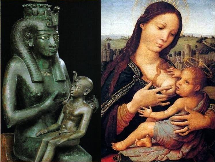 FOTO 1) Aqui está a extraordinária semelhança entre a Deusa Ísis e a Virgem Cristã. São diversas as semelhanças: o que chama a atenção é a centralidade de suas figuras na religião pagã e cristã. Ambas foram consideradas mortais, virgens e ligadas à figura do "Salvador", Hórus para Ísis e Cristo para Maria, que a iconografia clássica resume como a criança que seguram nos braços e que ambas amamentam.