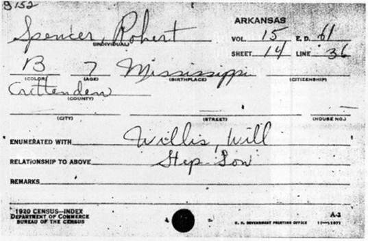 Это настоящая справка переписи населения 1929 года. В этот период маленький Роберт уже жил с матерью и отчимом – Дасти Уиллисом – в Арканзасе. Интересно, что в этой справке фамилия мальчика – Спенсер.