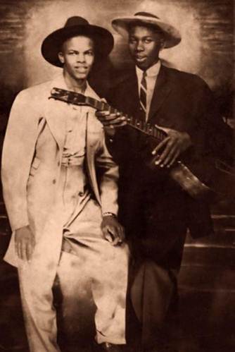 A história desta foto é extremamente singular: descoberta por acaso no Ebay em 2007 por um colecionador, publicada na revista Vanity Fair em novembro de 2008, foi finalmente autenticada em janeiro de 2013, após longas e cuidadosas dissertações sobre sua originalidade. O que me fazia duvidar, além da expressão do jovem Robert, que não parece ter NADA de demoníaco aqui, é que os botões da jaqueta de Shines parecem ser "femininos". A menos que o jovem Shines usasse a jaqueta de sua irmã, é possível que a foto original tenha sido “virada” e que o músico identificado como Johnson fosse na verdade canhoto, outro ponto a favor em sua natureza... Luciferina!