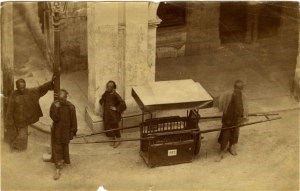 Uno de los trabajos más humildes en China era el del portador de rickshaw. Como veis en esta foto se trataba de hombres jóvenes envejecidos antes de tiempo que se ganaban la vida haciendo la parte del “caballo”. Mendigos, descalzos, con un bol de arroz al día, aceptaban hacer este trabajo humilde en China por necesidad. De hecho, los callejones Chinos muchas veces eran estrechos al más puro estilo medieval, y no permitían la entrada a un caballo. Se utilizaban por lo tanto servicios o esclavos que por 10 horas al día transportaban a toda prisa los Amos desde una parte de la ciudad a otra. La mayor parte de ellos morían de infarto antes de los 35 años .