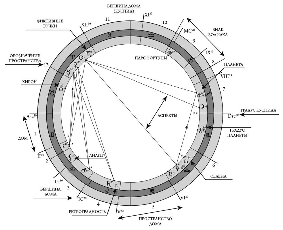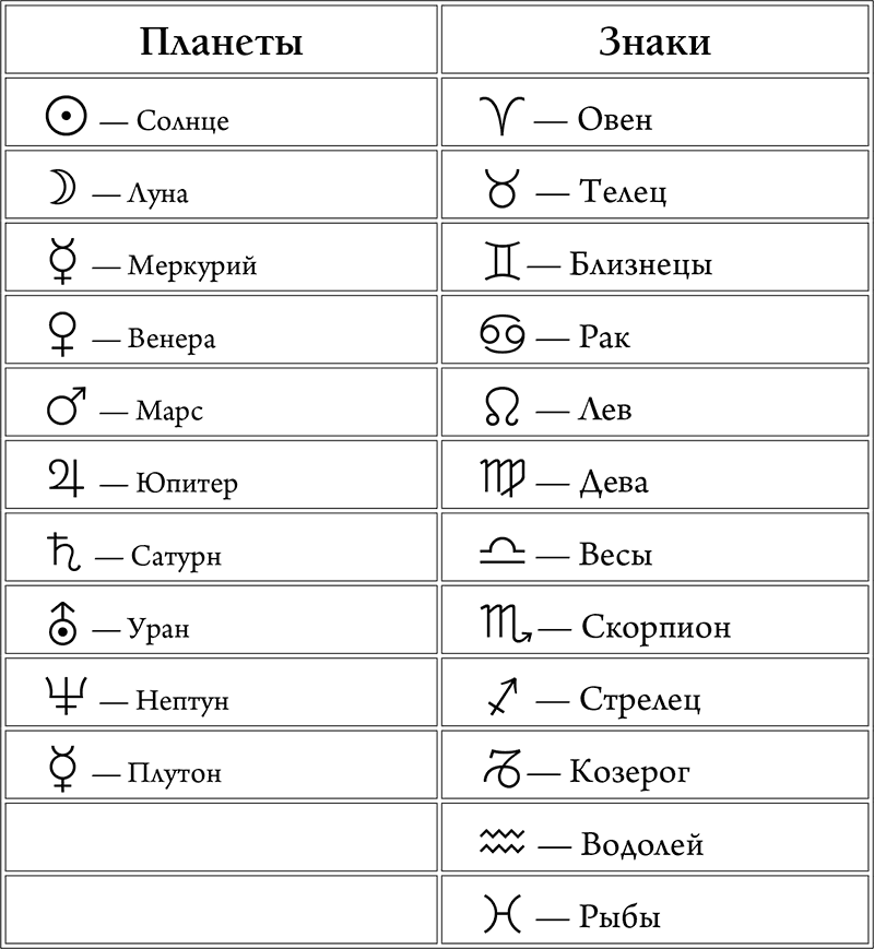 Схема-справочник: обозначение элементов карты, астрологическая символика