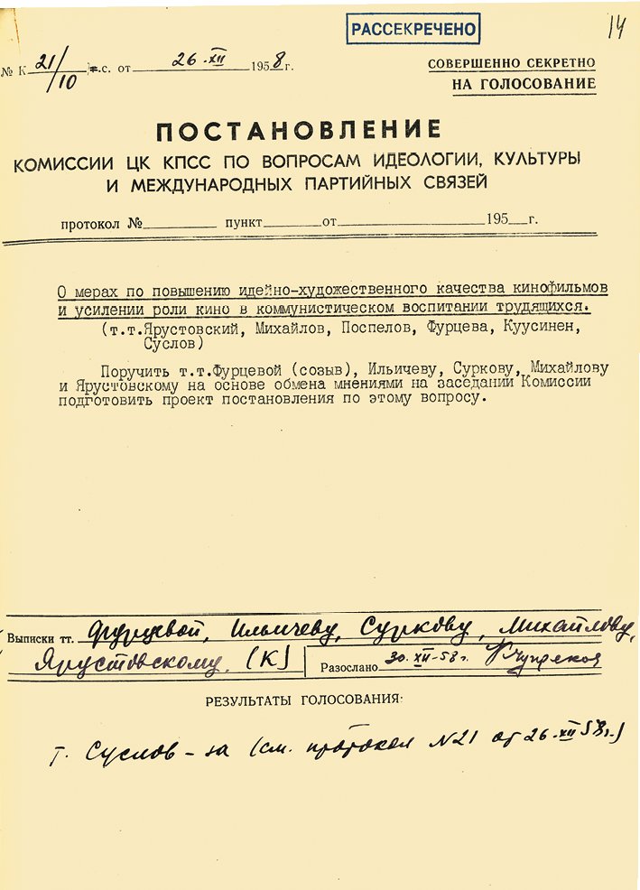 Постановление Комиссии ЦК КПСС «О мерах по повышению идейно-художественного качества кинофильмов и усилении роли кино в коммунистическом воспитании трудящихся»