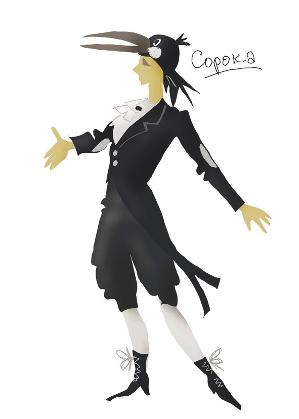 СОРОКА: Так я поела уже, а ты, наверное, голодный, от Волка бегамши? Вот я тебе приятное и сделаю. Заяц, даром почти отдаю. За четыре пятака уступлю! Ну что ты так смотришь?! Сама в два раза дороже купила!